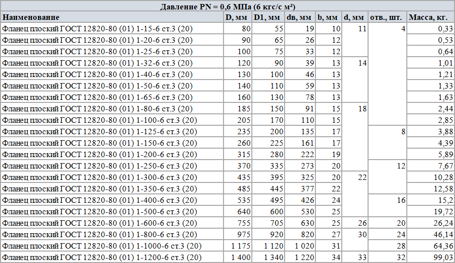 Таблица 1 — Фланец плоский 12820-80